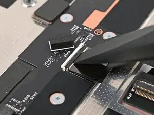 Используйте плоский конец отвертки Framework или чистый ноготь, чтобы поднять фиксатора на ZIF разъеме кабеля средней пластины.