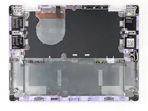 Отвёрткой Framework удалите шесть (по три на каждый шарнир) винтов T5 Torx длиной 4,5 мм, крепящих два шарнира.