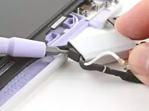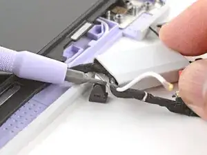 Просуньте плоский край отвёртки Framework под белый антенный кабель как можно ближе к металлической головке.
