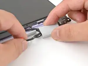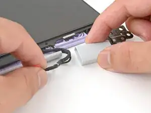 Поднимите чёрную пластиковую петлю, фиксирующую антенный кабель, рядом с вентиляционными отверстиями у левого шарнира, пальцами.