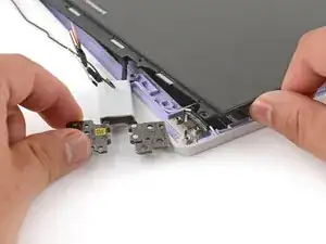 Используйте отвёртку Framework, чтобы выкрутить шесть винтов T5 Torx длиной 4.5 мм (по три на каждый шарнир), удерживающих оба шарнира.