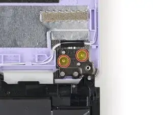Используя отвертку Framework, выкрутите два винта T5 Torx длиной 2,4 мм, которые фиксируют правую петлю к верхней крышке.
