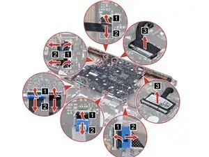 Снимите 7 чёрных винтов PH1 длиной 6 мм (M2 x L6), удерживающих вентиляторы.