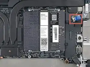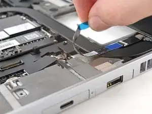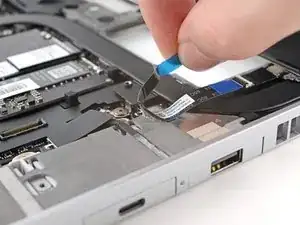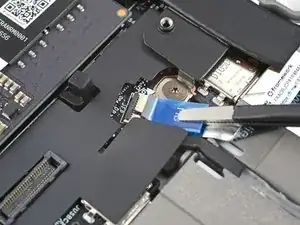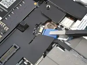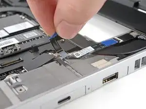 Используя пинцет или пальцы, захватите синюю тянущую вкладку и вытяните кабель датчика отпечатков пальцев прямо из его гнезда.
