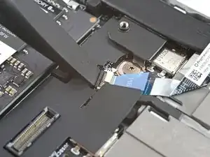 Используйте плоский конец лопатки или чистый ноготь, чтобы поднять фиксирующую защёлку на ZIF-разъёме датчика отпечатков пальцев.