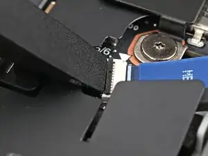 Используйте плоский конец отвертки Framework или чистый ноготь, чтобы поднять защелку на ZIF-разъеме датчика отпечатков пальцев рядом с памятью.
