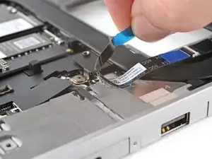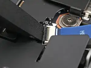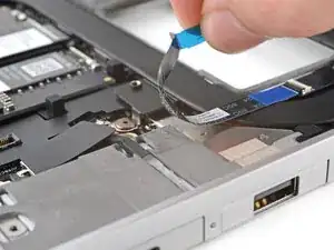Используйте пальцы, чтобы взять за синюю петлю и аккуратно вытянуть кабель датчика отпечатков пальцев из разъема.