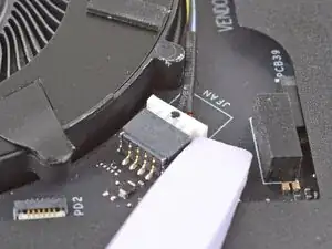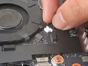 Используйте пальцы и отвертку Framework, чтобы сдвинуть разъём вентилятора из его гнезда.