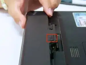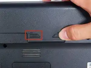 Нажмите и удерживайте правый переключатель, на котором написано "release" выше него, и поднимите батарею из её места.