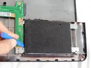 С помощью синего пластикового инструмента iFixit сдвиньте жесткий диск вправо, чтобы вынуть его из корпуса.