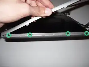 Удалите 5 винтов и аккуратно снимите рамку экрана (облицовку), чтобы открыть ЖК-панель и монтажные винты, расположенные вдоль каждой стороны ЖК-экрана.