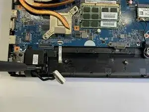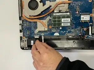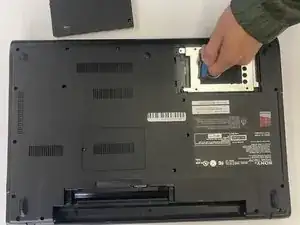 После снятия винтов удерживайте синию ленту, прикреплённую к жёсткому диску, и извлеките его из ноутбука.