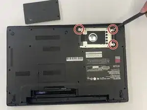 Используйте крестовую отвёртку Phillips #00, чтобы удалить два винта, крепящие крышку отсека жёсткого диска.