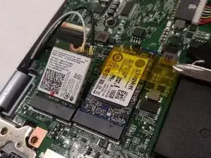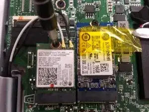 Осторожно отогните жёлтую ленту, либо полностью снимите её. С помощью той же крестовой отвертки PH0 выкрутите один винт, соединяющий материнскую плату с платой Wi‑Fi.