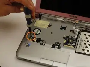 С помощью отвертки с битой Phillips #0 удалите два отмеченных винта с маркировкой F6. (Они удерживают клавиатуру) один винт может находиться под резиновой заглушкой