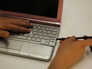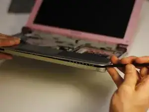 Используйте лопатку, чтобы аккуратно поддеть по шву клавиатуры. Это освободит узел клавиатуры от корпуса.