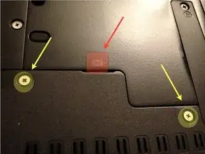 Переверните компьютер и найдите панель доступа к памяти (обведена жёлтыми линиями).