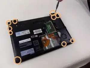 Снимите заднюю крышку, вывернув винты, чтобы обнажить оптический привод. Удалите винты длиной 1 см. Затем используйте лопатку, чтобы поддеть и снять крышку.