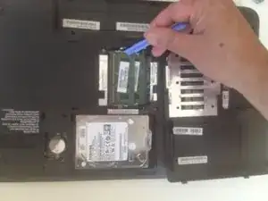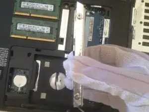 Снимите крышку отсека HDD/памяти, закреплённую одним винтом Phillips.