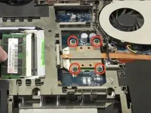 Найдите крышку на задней панели ноутбука, по диагонали от отсека для батареи. Удалите четыре винта, которые фиксируют крышку.