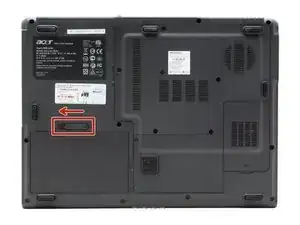 Найдите табличку с символом батареи на задней панели ноутбука. Сдвиньте ее влево, чтобы извлечь батарею.