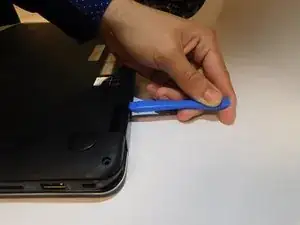 Начните с верхнего правого угла, используя пластиковый инструмент для вскрытия, чтобы отделить крышку от ноутбука. Используйте легкое давление, чтобы предотвратить поломку пластика.