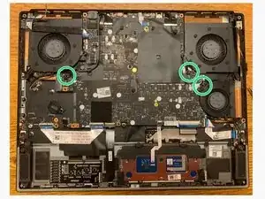 Удалите вентиляторы - будьте осторожны с кабелями антенны Wi-Fi около верхнего левого вентилятора и кабелем динамика около маленького нижнего правого вентилятора.