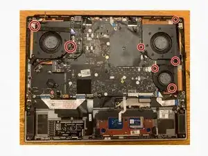 Удалите 7 черных винтов PH1 размером 6 мм (M2 x L6), удерживающих вентиляторы.