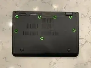 Переверните Chromebook и выкрутите винты, крепящие заднюю панель.