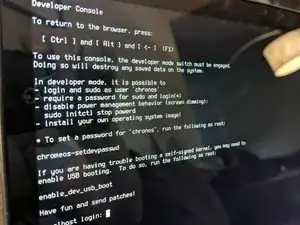 В строке приглашения с «localhost login» введите «chronos» в качестве логина. Это изменит приглашение на «chronos@localhost» и даст вам права, необходимые для выполнения следующего шага.