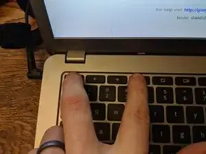 Чтобы запустить Режим восстановления, удерживайте клавиши Esc (верхняя левая) и Refresh (трёх клавиш справа от Esc на этой модели), затем на мгновение нажмите кнопку питания (в правом верхнем углу), пока устройство не включится.