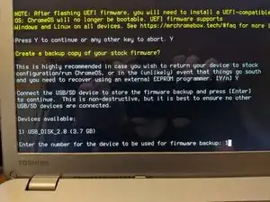 Также вам предложат создать резервную копию штатной прошивки. Следует ответить «Y» на это и подготовить другой USB-накопитель, если он у вас есть. После того как вы сохраните резервную копию на USB-накопитель, загрузите её куда-нибудь в интернет для дополнительного резервирования!