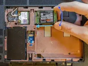 Теперь аккуратно начните вставлять SSD, сохраняя наклон. Следуйте направлению светло-голубой стрелки и идите медленно.