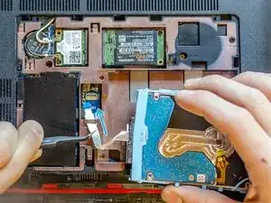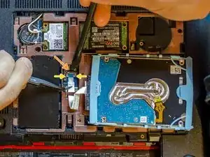 Вы заземлены? Если да, с помощью лопатки откиньте вверх маленький чёрный фиксатор ZIF-разъёма кабеля жёсткого диска.