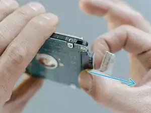 Уложите HDD. Захватив пластиковую ленту SATA-кабеля пинцетом, переместите её, чтобы правильно уложить синюю конечную часть в ZIF-коннектор: её два синих нижних угла должны совпадать с белыми квадратами коннектора.