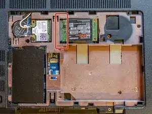 СТОП, когда почувствуете, что больше модуля не протолкнуть. Вы должны заметить, что SSD не лежит идеально горизонтально — это нормально. Теперь, используя отвёртку PH#00 и винт Phillips PM 2.0x2.5, который вы подготовили перед началом руководства, закрепите SSD на корпусе ноутбука, не перетягивайте этот винт.
