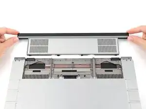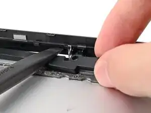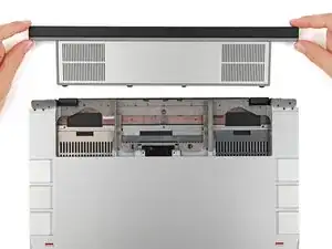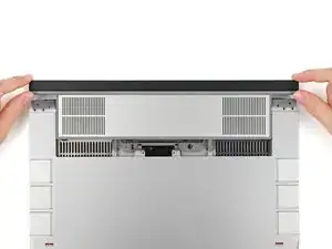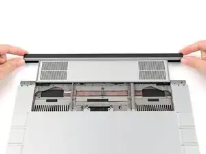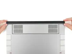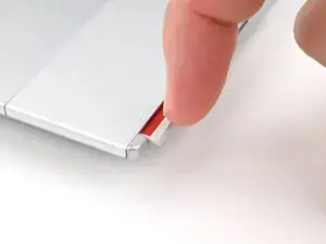 С помощью пальцев сдвиньте распорку тачпада в направлении нижнего края ноутбука и отщёлкните её.