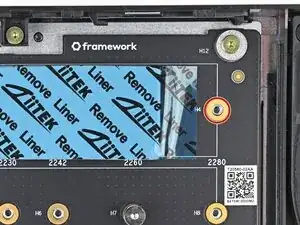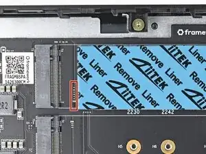 Используйте отвертку Framework, чтобы удалить один или оба винта T5 длиной 6.7 mm для SSD, в зависимости от того, сколько SSD вы устанавливаете.