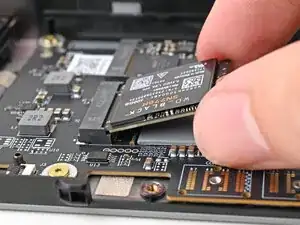 Вставьте SSD в разъем под небольшим углом. Золотые контакты должны быть в основном закрыты разъемом.