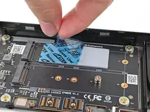 Не снимая защитных пленок, поместите теплоотводящую прокладку над слотом, где вы собираетесь установить SSD.