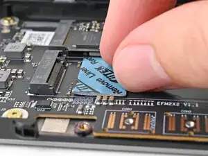 Ориентируйте термопрокладку так, чтобы она располагалась между маленькими компонентами рядом с разъёмом SSD и отверстием для винта — включая золотое кольцо вокруг него.