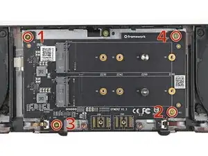 Используйте отвертку Framework, чтобы затянуть два вкручиваемых винта T5 Torx, фиксирующих корпус отсека расширения.