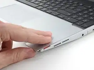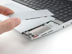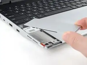 Используя пальцы, сдвиньте разделитель тачпада к нижнему краю ноутбука и отсоедините его.