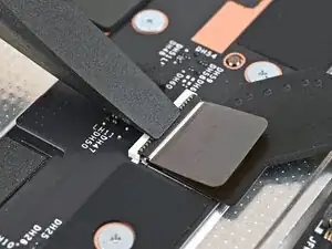 Используйте плоский конец отвертки Framework или чистую ногтевую пластину, чтобы нажать на фиксирующий язычок разъема ZIF кабеля средней панели.