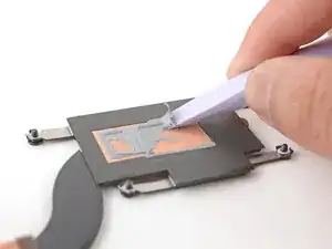 Используйте плоский конец отвертки Framework, чтобы соскоблить и удалить остатки термопасты с радиатора.