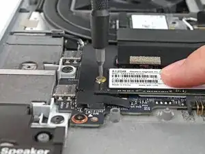 Держите SSD ровно на материнской плате и с помощью вашего отвертки Framework установите винт T5 Torx длиной 2 мм, фиксирующий SSD.