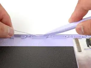 С помощью пальцев и отвертки Framework направьте и прижмите оба антенных кабеля обратно в их канавки.