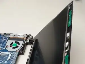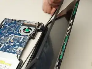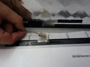С помощью пластиковой язычка отогните ленту, фиксирующую кабель ЖК к разъёму панели.