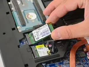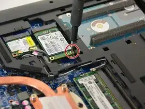 Удалите фиксирующий винт твердотельного накопителя крестовой отверткой.
