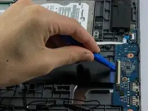 Большой черный шлейф прикреплен к разъему. С помощью синего инструмента для открытия, поднимите разъем ZIF (с нулевой силой вставки), затем подденьте разъем под углом от 0 до 90 градусов. Будьте осторожны, чтобы не сломать разъем, он очень хрупкий.
